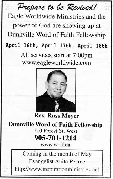 The advertisement stated "Eagle Worldwide Ministries and the power of God are showing up at the Dunnville Word of Faith Fellowship." The issue which bothered me is not the visit from Eagle Worldwide Ministries, but the idea that they were somehow bringing the power of God with them.