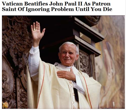 It's been two months since I last commented on the Vatican's continuing failure to produce its promised policy on child abuse by clergy. It is understandable of course that they have not had time to deal with such a minor matter as the protection of children when there far are higher priority issues such as doing a rush job on moving JPII towards sainthood. Beatification took place this week. Vatican efforts will now be concentrated on coming up with a halfway credible second miracle.