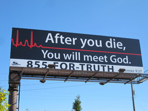 Driving east across the US about a month ago, I got the feeling there were less religious billboards* than I had seen in the past. Or perhaps I just did not see them due to a preoccupation with the family matters that required me to make the trip. Coming back, I took a different route which I had not travelled before, returning through Missouri and Kansas. And I have to report that at least in some areas of the USA, religious billboards are still flourishing, and still thoroughly dishonest.