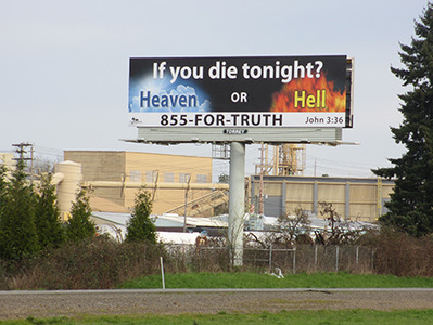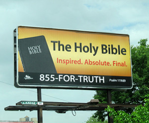 Driving east across the US about a month ago, I got the feeling there were less religious billboards* than I had seen in the past. Or perhaps I just did not see them due to a preoccupation with the family matters that required me to make the trip. Coming back, I took a different route which I had not travelled before, returning through Missouri and Kansas. And I have to report that at least in some areas of the USA, religious billboards are still flourishing, and still thoroughly dishonest.