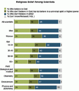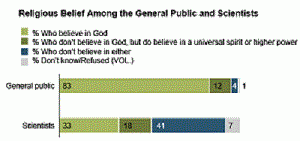 How do the numbers measure up to Mr. Krauss’ thesis? A survey of scientists who are members of the American Association for the Advancement of Science, conducted by the Pew Research Center for the People & the Press in May and June 2009, finds that members of this group are, on the whole, much less religious than the general public. Indeed, the survey shows that scientists are roughly half as likely as the general public to believe in God or a higher power. According to the poll, just over half of scientists (51%) believe in some form of deity or higher power; specifically, 33% of scientists say they believe in God, while 18% believe in a universal spirit or higher power. As for philosophers, 93% either doubt God or disbelieve in God, up from an astonishing 85% in 1933 and 73% in 1914[52]. Some 73% of philosophers are atheist, with only 15% being theists[53]
