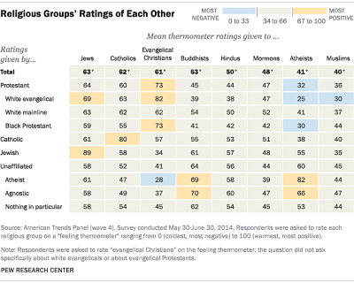 We share this planet, so we need to learn to coexist. It’s no surprise that according to a Pew study, members of the same group tend to favor each other the most. It is simply human bias, we can overcome this natural bias but it is our baseline. Think of these feelings as degrees on a thermometer, certain groups have been found to be seen as more universally warm, others are given the cold shoulder.