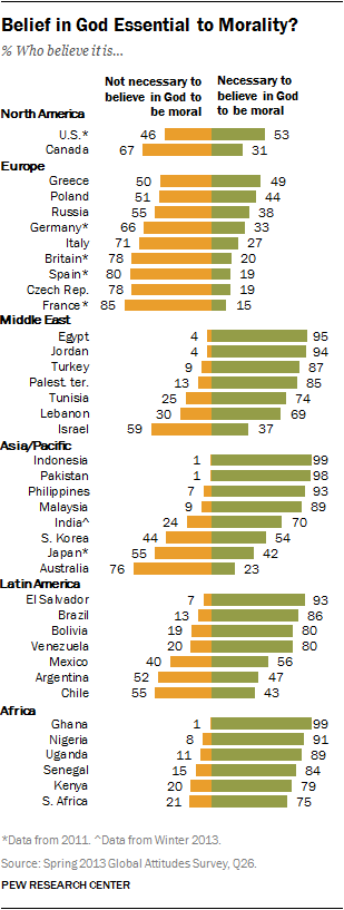 A common question in religious discourse asks whether belief in the divine makes one behave better or worse; or, more precisely, whether religious belief is essential to ascertaining objective morality. A Pew Global study in 2014 showed that more than half of Americans (53%) believe that it is “necessary to believe in God to be moral”. Such an approach has likely had a significant impact on American policy-making. Indeed, which aspiring Presidential candidate could conceivably build an electoral campaign without professing a belief in the supernatural – a position essential to achieving an objective morality for 53% of Pew’s respondents?