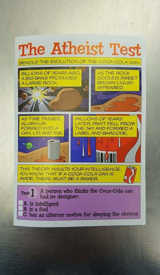 Now this little test - and it is little in spite of being spread out over five tedious pages - contains a number of lame arguments for intelligent design and the existence of the Christian God. And it is not surprising that the arguments are lame because the "test" is adapted from the works of Ray Comfort - you know that the banana is the atheist's worse nightmare guy - and yes - the argument immediately following the evolution of the coke can in this test is the re-iteration of the banana nonsense.
