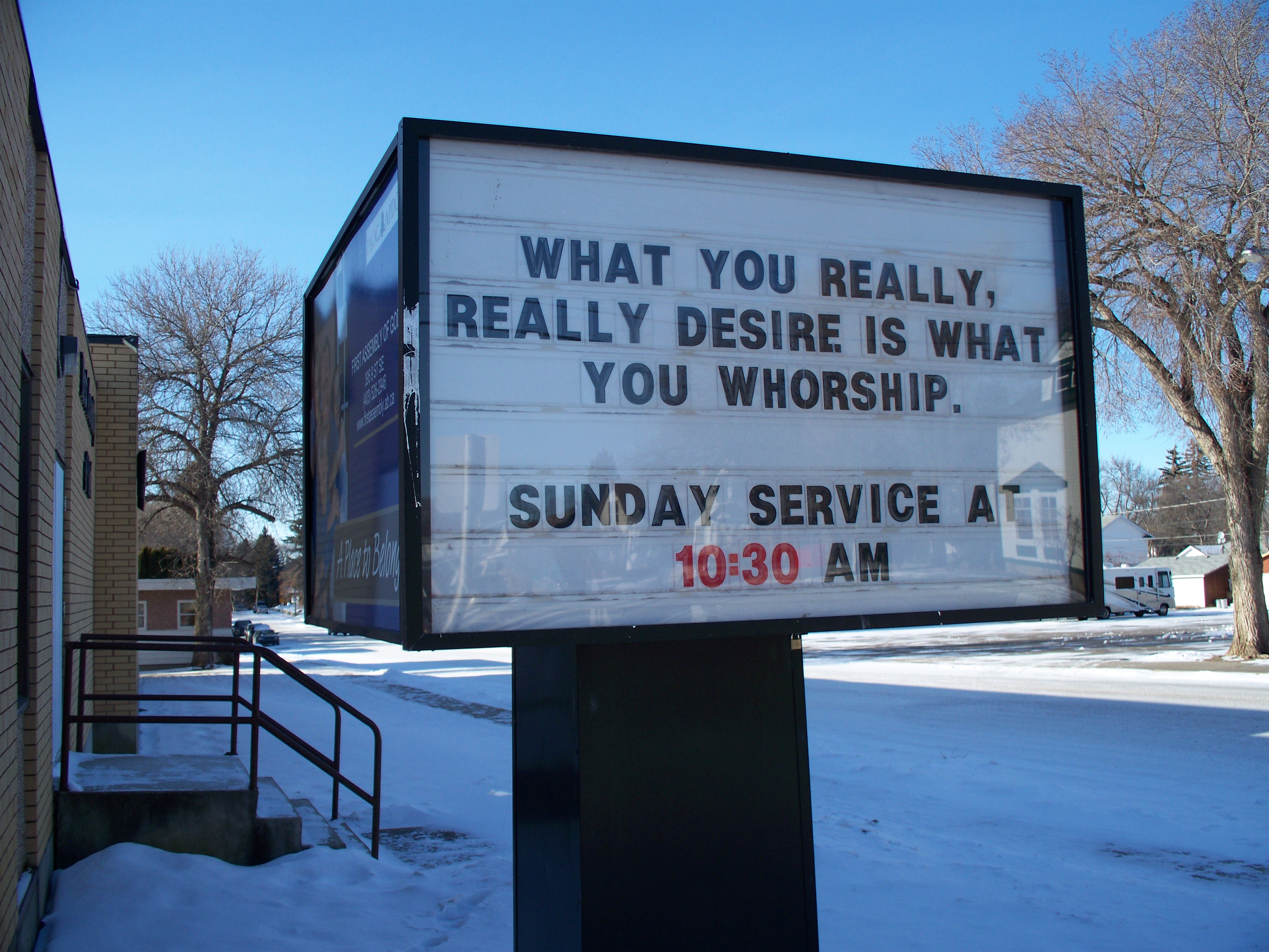 Photograph of a church sign taken 25 Jan 2008 at the Medicine Hat First Assembly of God. Image is unaltered except for cropping and file size reduction for easy display. Original full unedited image (2 meg) is here.For the other side of this sign, see Meditation 661