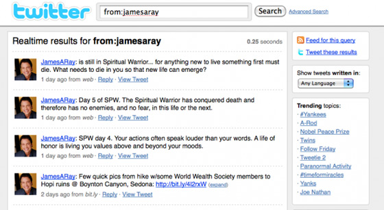 Apparently James Arthur Ray was twittering to his other followers[2] while leading this Spiritual Warrior retreat, including while in the sweat lodge. Shortly after the horrifying deaths he deleted his twitter account. However, some of his tweets were recovered - which might indicate why he deleted that account.