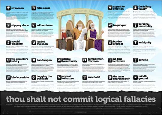 There's a great poster (much higher quality than the sample image below) on logical fallacies available in three different sizes as a free download from Thou shalt not commit logical fallacies. If not for yourself, get it for the kids.